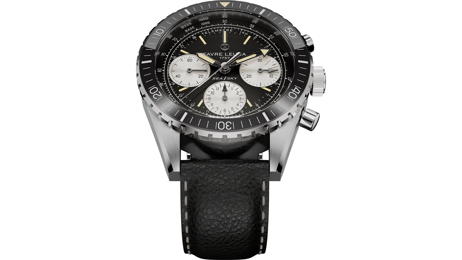 The classic dial of the Sea Sky Revival carries pleasing vintage aesthetics with an understated matte finish, complemented by retro-inspired index hour markers and faceted hands. It features a clean tri-compax chronograph configuration, with contrasting sub-dials that stand out against the black backdrop for enhanced legibility. The sub-dials track minutes at two o’clock, hours at six, and running seconds at nine.