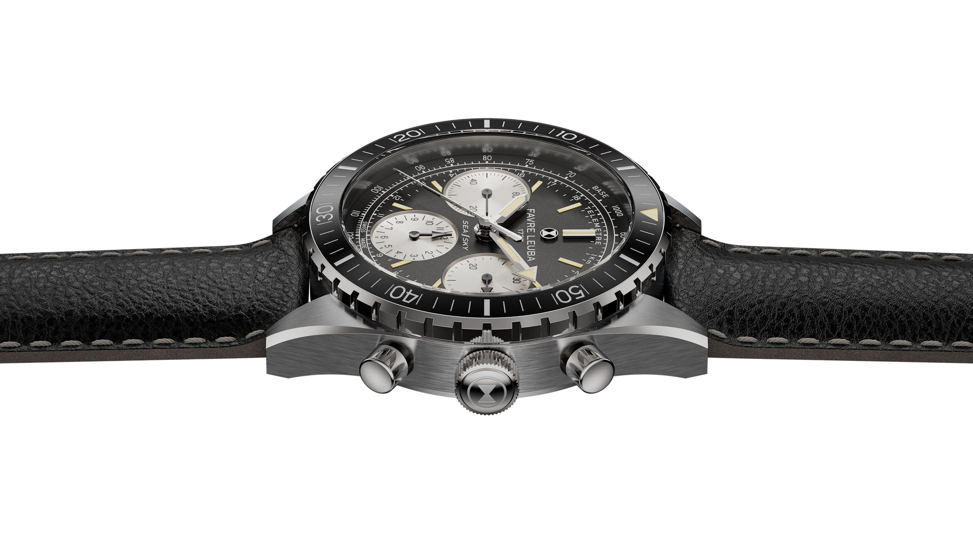 Surrounding the perimeter of the dial are a tachymeter and a telemeter scale, while a minute track sits resolutely on the internal rehaut, allowing for a well-defined and intuitive reading experience. The tachymeter scale helps calculate the speed of a moving object, while the telemeter scale helps calculate the distance from the source of the sound. The Favre Leuba monogram punctuates the dial with a signature finish.
