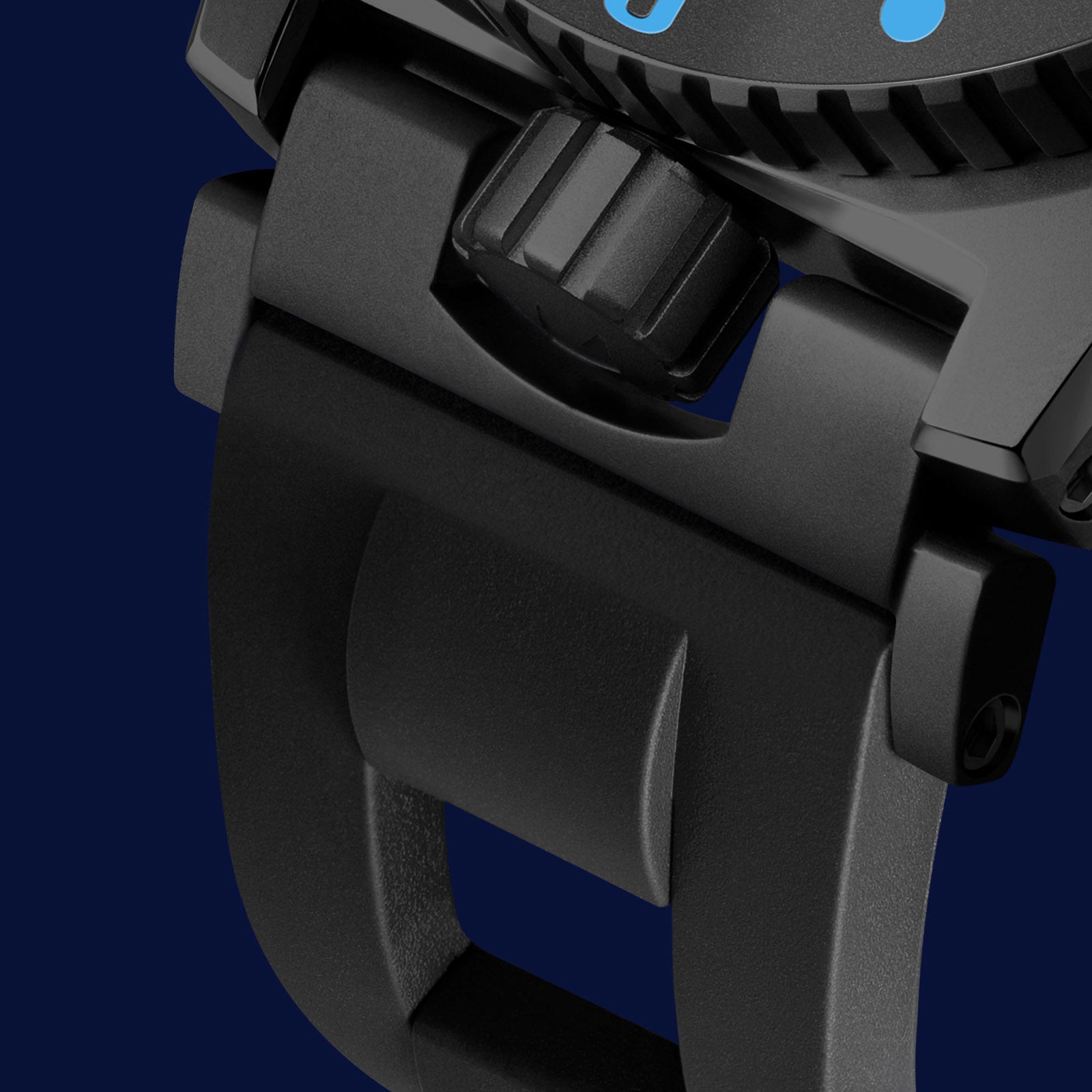 A total black look for the GF50678 with its monochrome dial and titanium case with diamond light coating (DLC)! The readability of the time data is ideal with the help of the blue Super-Luminova® coating of the numbers, markers, and hands. Similar to all ZRC® divers, this model features the latest innovations in programmed deformation of material to ensure uncompromising water resistance to a depth of 3,000 meters. Thanks to its optimized ergonomics, versatility, and comfortable adjustable rubber wristband, the GF50678 offers a sporty-chic look to be worn on any occasion.
