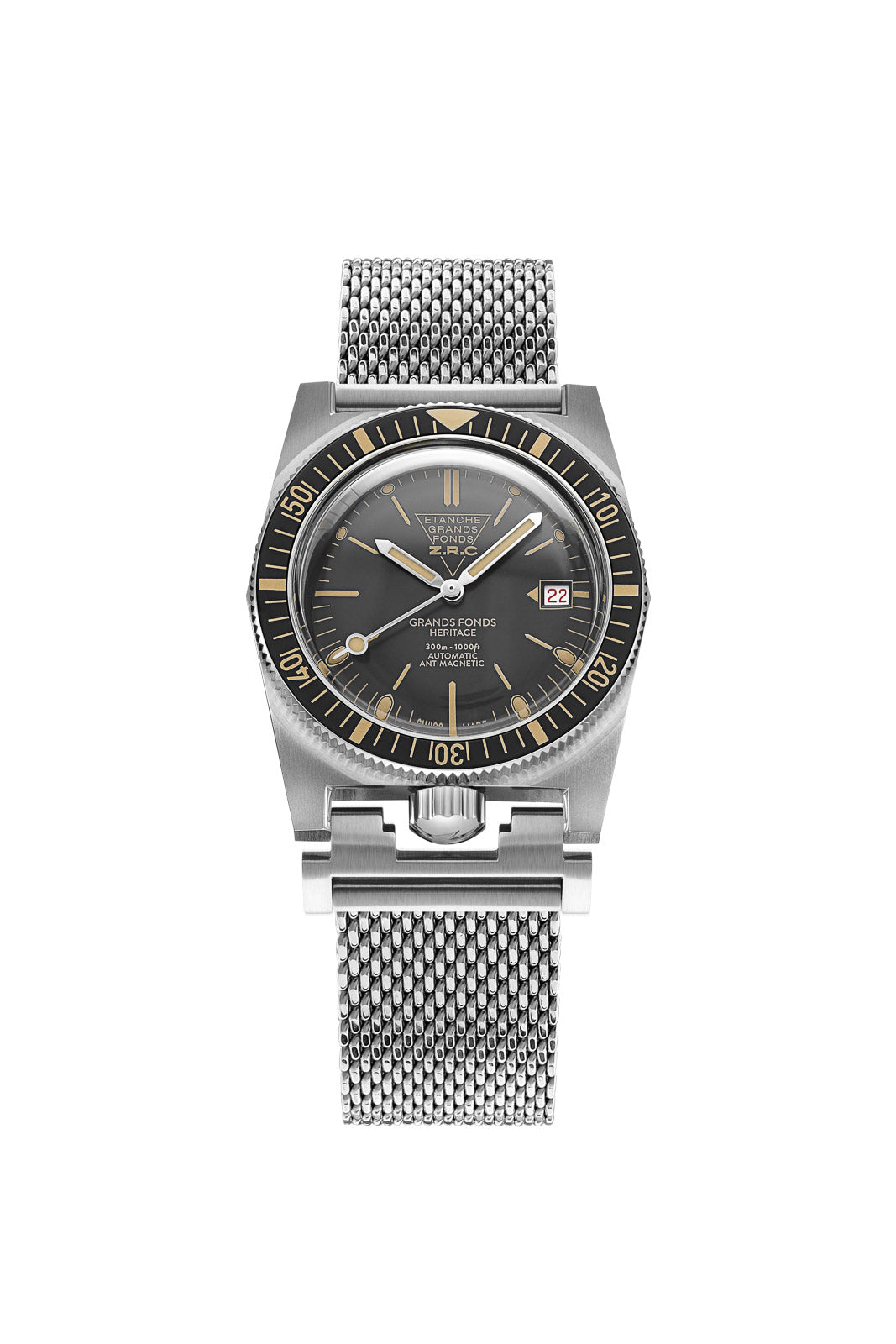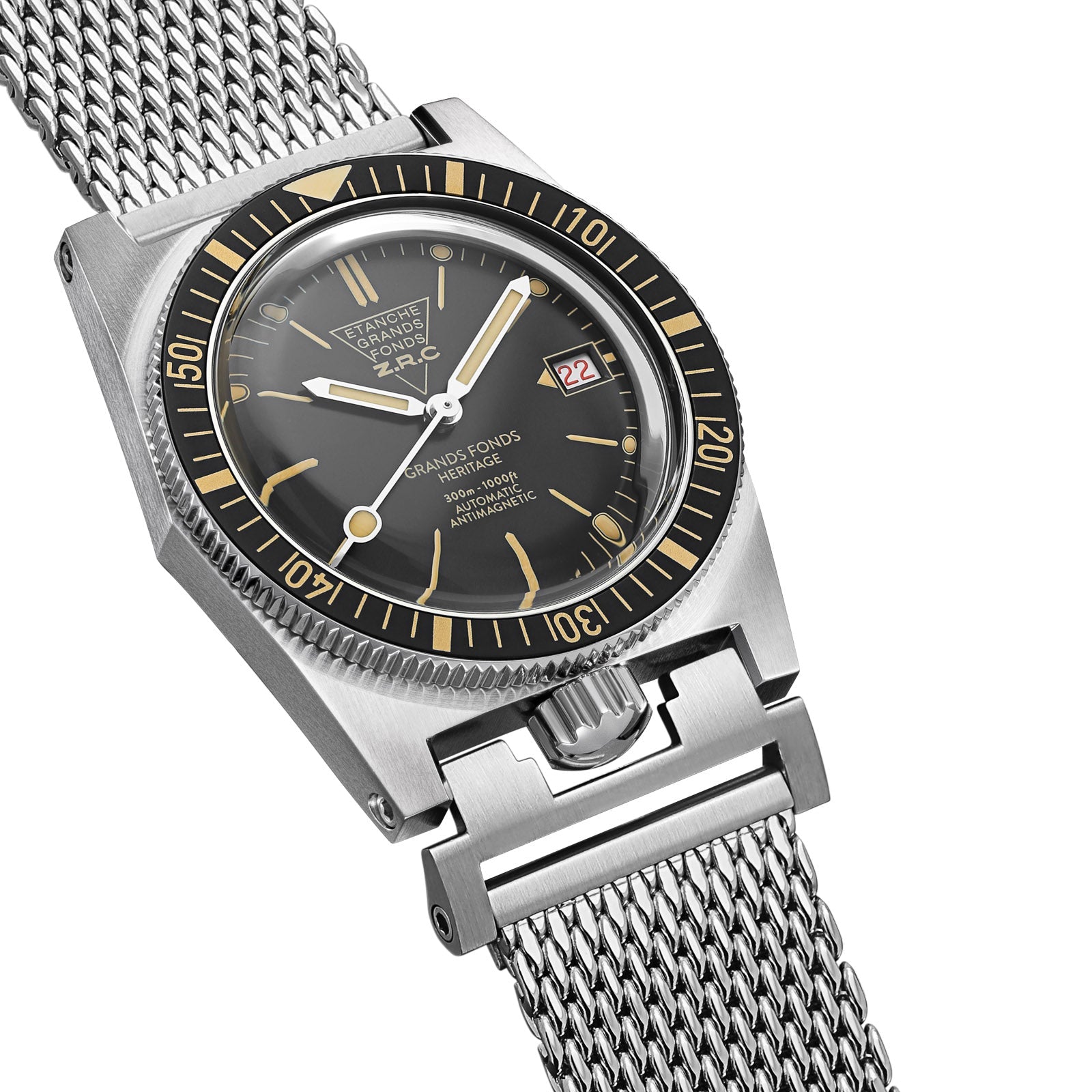 Both sober and elegant, the new «VINTAGE» Grands Fonds® from the HERITAGE range, although tailored for adventure, becomes an indispensable companion on a daily basis. Without denying its diver’s ADV, the timer of its bezel and the finesse of its needles and its eggshell finish gives it a “Vintage Sport” character. Its precise and safe Swiss caliber will bring you comfort and safety. At ease on a male and female wrist she is the ideal companion of your daily life.
